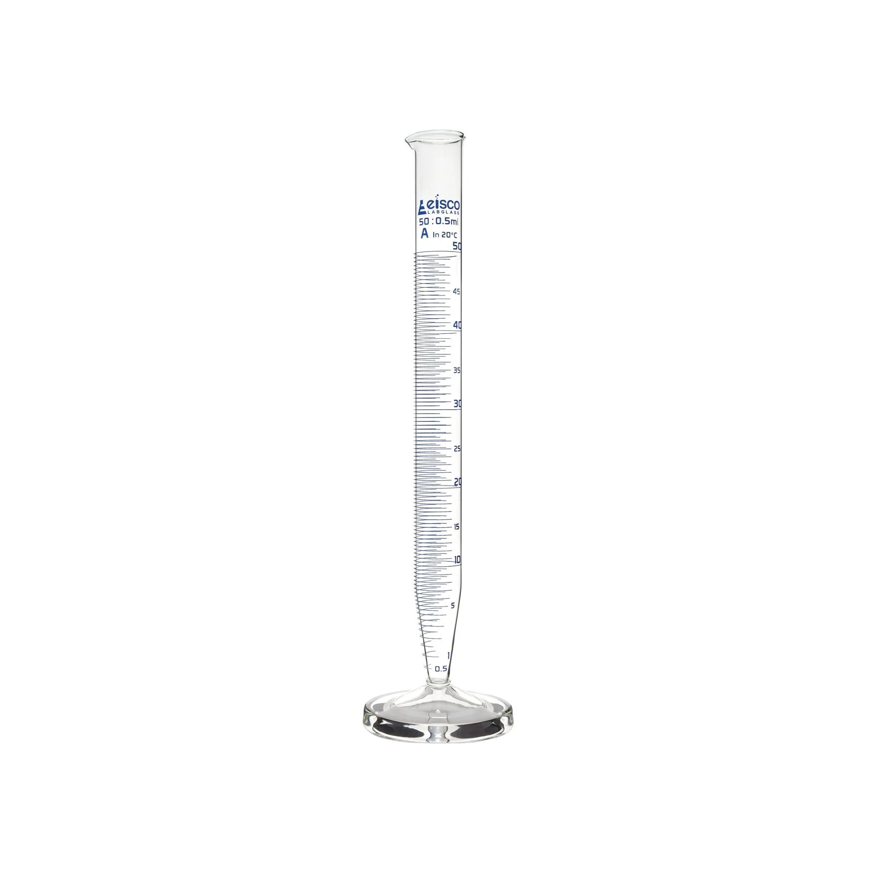 50mL capacity crow receiver made of high quality, heavy duty Borosilicate 3.3 glass. Round base for extra stability. Class A tolerance, as per DIN ISO 385. Easy to read, blue printed graduations and specifications. Graduation lines every 0.5mL, marked every 5mL. Calibrated to contain.