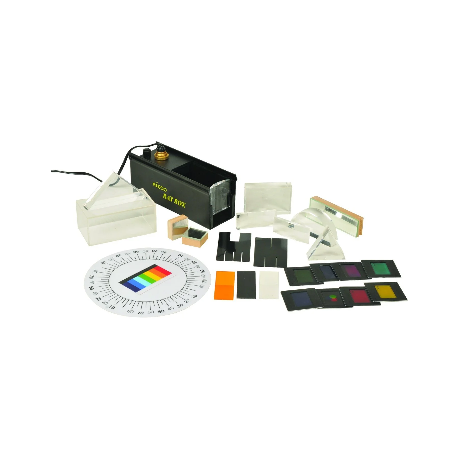 Included in Kit: (1) Light/Ray box with hinged mirrors, (1) Lamp holder, (2) 12V (20W) bulbs, (2) 4mm banana plug leads, (2) Slit plates, (8) Mounted color filters, (8) Color cards, (1) Rectangular prism, (1) 45/45/90 prism, (1) Equilateral prism, (1) 30/60/90 triangular prism, (1) Semicircular prim, (1) Bi-concave lens, (2) Bi-Convex lens, (1) Plane mirror on stand, (1) Parabolic mirror, (1) Semi-circular mirror, (1) Semi-circular Dish, (1) Manual