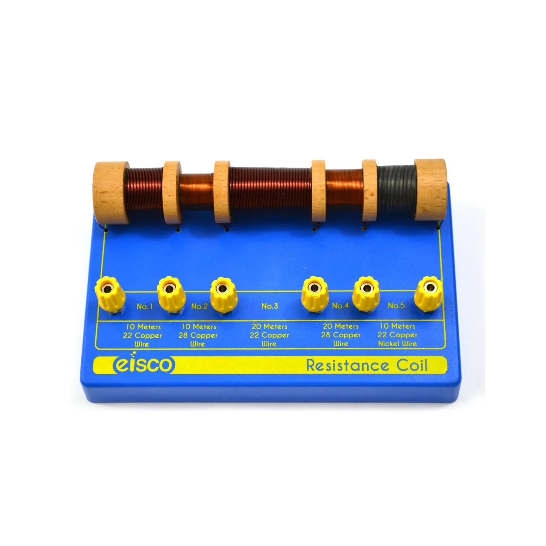 A quality unit for your experiments, coiled around a divided wooden spool are 4 lengths of copper wire (22 gauge, 10m long; 22 gauge, 20m long; 28 gauge, 10m long and 28 gauge, 20m long) and 1 length of copper-nickel wire (22 gauge, 10m long). The spool is mounted on a lightweight base with 6 binding posts. Labels indicate each wire's type, length and gauge. To measure resistance, connect the mounted coils to your Wheatstone bridge, digital ohmmeter or Multimeter that measures ohms. Computations are simplified thanks to the coils' 2:1 length ratios.